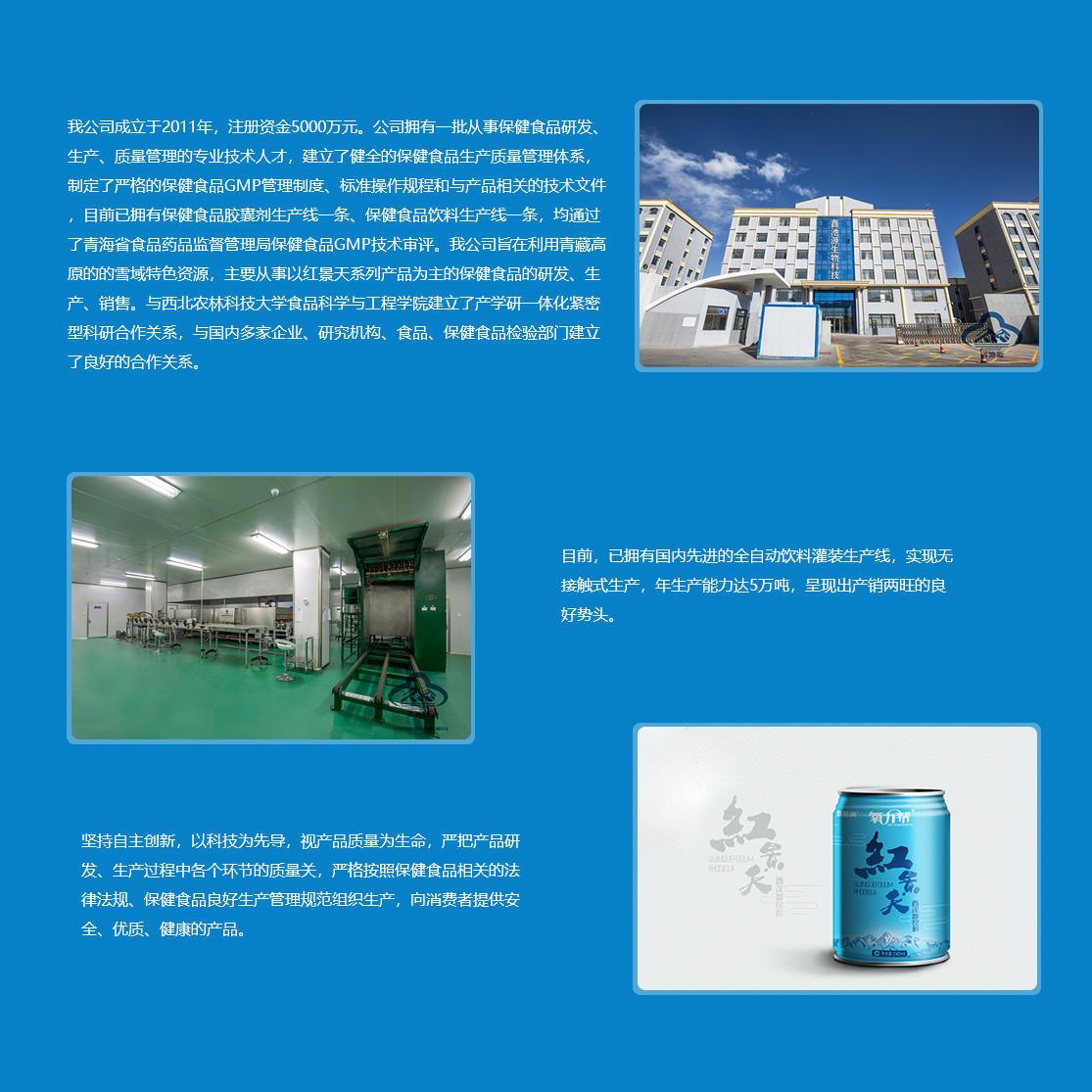 鑫池源公司立足于青海省綠色環保無污染的高品質紅景天資源,以西北農林科技大學食品科學與工程學院和青海格拉丹東藥業有限公司為技術依托,主要從事紅景天、紅枸杞、黑枸杞等高原生態植物資源的研究開發和深加工,產品包括“景胨”牌紅景天西洋參保健飲品、紅景天口服液、紅景天膠囊等系列產品。